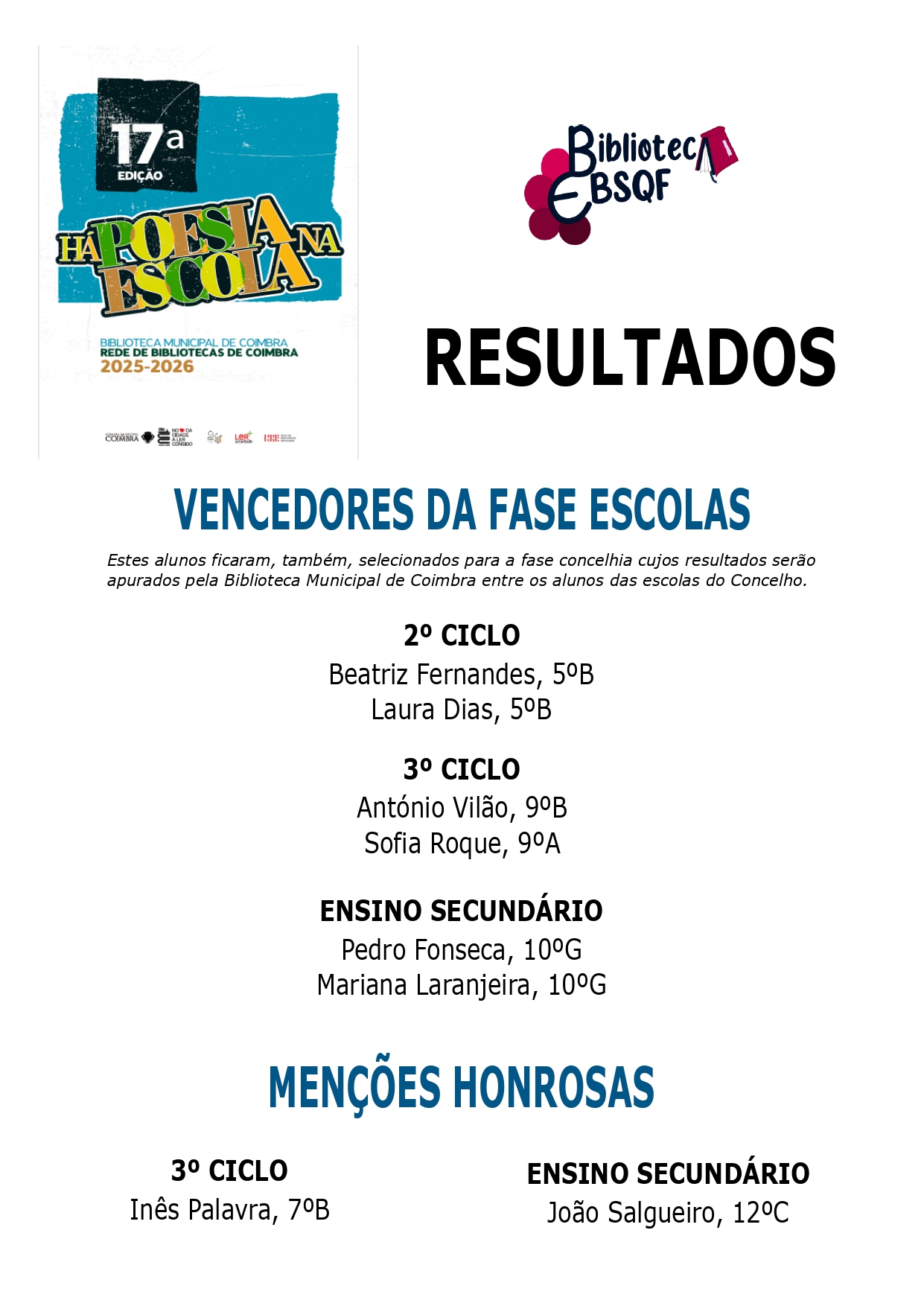 Resultados da 1ª fase do concurso da Rede de Bibliotecas de Coimbra, “Há poesia na escola?”